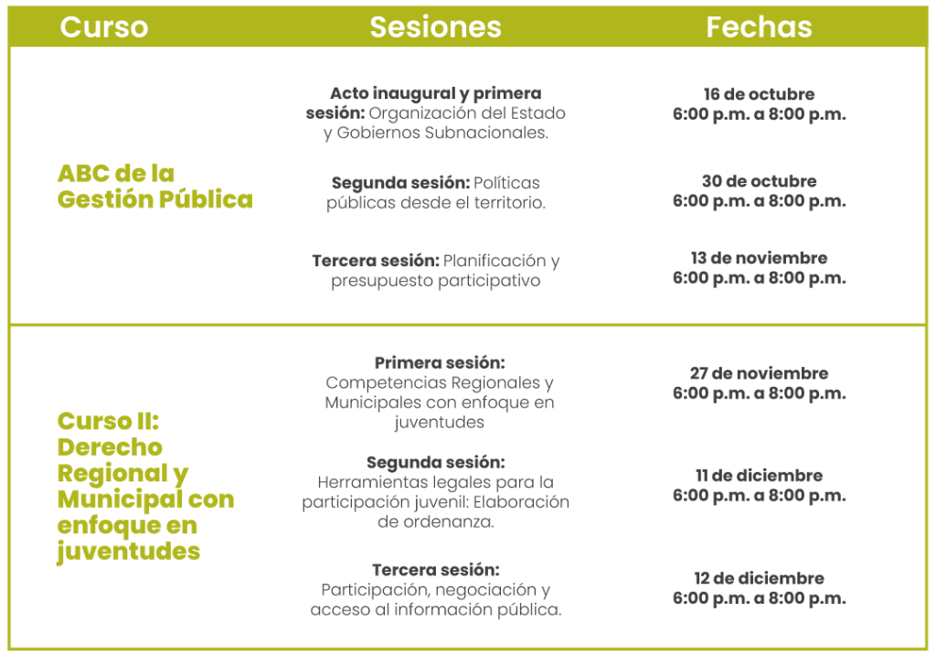El programa está conformado por 2 cursos que se desarrollarán en modalidad virtual. Se desarrollará una sesión cada dos semanas del 16 de octubre al 12 de diciembre de 2025. Los cursos incluyen sesiones virtuales en vivo y eventos interactivos con dinámicas colaborativas (06 sesiones). El acto inaugural y primera sesión: 16 de octubre de 2025, de 6:00 p.m. a 8:00 p.m.
